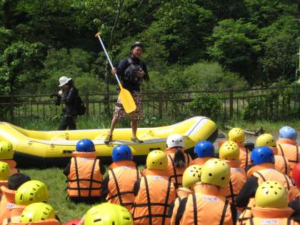 インストラクターから、ラフティングのレクチャーを受けました。楽しく盛り上げてくれるインストラクターの話に、みんながハイテンションに!