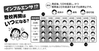 手をよく洗い、マスクをするなど、風邪にかからないように気をつけましょう。インフルエンザは出席停止となります。熱が下がっても二日間は出席停止です。完治してから登校しましょう。