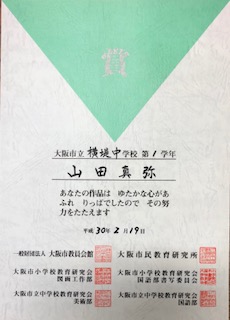 第58回大阪市中学校生徒作品展が2月17日(土)から19日(月)まで森之宮の大阪市教育会館で行われます。是非ご観覧ください。本校では、一年生山田さんが「新たな決意」の作品で表彰され展示されています。