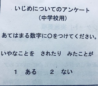 大阪市は安心安全な学校づくりに努めています。そんな中で心痛める大阪市の中学生が、学校生活を苦にしたのか死を選んでしまうということが1月に起りました。学期末ですが、次の学年に進級しようとするこの時期、子どもの心は何かと不安が募り、悩みを抱えていることが多いものです。特にいじめについて、学級では再度調査を行い、子どもの心の内を確認したいと思い、アンケートを実施します。どうかご家庭でも、子どもの発するサインに気づき、何かありましたらすぐに学校に連絡をください。