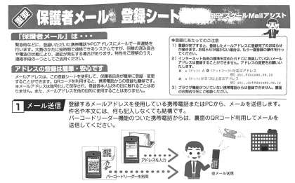 本日、保護者メール登録シートをお配りいたします。緊急の下校措置などの際に、このメールやホームページを通じてご連絡いたしますので、お子様が持ち帰った登録用紙をご確認いただき、ぜひ登録の手続きをよろしくお願いいたします。