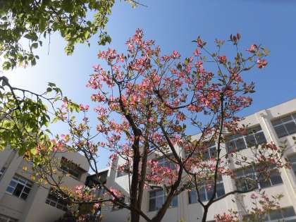 ”ハナミズキ”は鶴見区の花の一つです。(ほかに、つばき、チューリップ、ニチニチ草も鶴見区の花となっています)。淡いピンクの桜の花が散ったあとは、校庭に白と赤のハナミズキが目を愉しませてくれています。さわやかに晴れあがった青空と新緑の樹々に、ハナミズキが鮮やかに映えています!花と緑いっぱいの校庭です♪