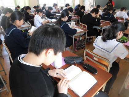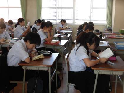 2年生では現在、学年の取り組みとして朝の読書活動を行っています。写真は本日(11日)の様子です。各自が持参した本を朝礼時の時間を利用して読み進めます。物音ひとつ聞こえない落ち着いた雰囲気の中で、1時間目の授業がスタートします。生徒たちはみんな集中し、本の世界にひたっていました。