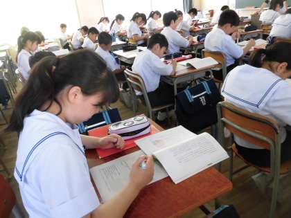 写真は本日(21日)、1年生の道徳の時間の様子です。文岩教諭の質問に一つ一つ答えながら、資料(副読本)の文章や主人公の心境の変化を丁寧に読み進めるとともに、主人公の立場になって自分の考えをワークシートに書いていました。生徒たちは文章の読解や意見や感想の記述等、しっかり集中して授業に臨んでいました。道徳の時間は、来年4月より「特別な教科・道徳」となり、新たに教科書も配布されます。本校でも道徳に関する研修をさらに深めていきたいと思います。