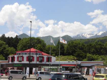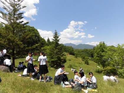 バスは予定より10分早く、11時35分に駒ケ岳SAに到着しました。バスの長旅ですが、生徒たちはとても元気です。北アルプスの駒ケ岳の頂上付近には、真っ白な雪が残っており、ぬけるような青空とみずみずしい新緑とのコントラストが見事です。みんな楽しそうに、またおいしそうに弁当を食べていました。12時30分に出発し、一路、今日の目的地の安曇野に向かいます。