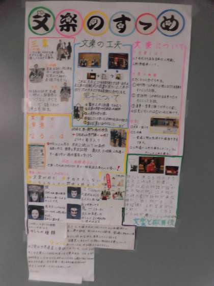 6月15日(金)に、2年生は国立文楽劇場に行き、文楽を鑑賞することになっています。目的は「文楽を通して、日本の伝統芸能を身近なものとして親しむ」ことです。この日は学校から電車で国立文楽劇場(大阪市中央区日本橋)に向かいます。終了後は再び学校に戻ってくることになっています(昼食は持っていきます)。当日のプログラムは『二人三番叟』と『絵本太功記(えほんたいこうき)』です。『絵本太功記』は、明智光秀の物語が題材になっています。当日は劇場で文楽についての解説コーナーもあり、中学生にとっても大変わかりやすく、文楽に興味を持てるように工夫されています。廊下には文楽について2年生の図書委員の生徒たちが事前に調べた壁新聞が展示されています。写真も貼られていてとてもカラフルでわかりやすく仕上がっています。