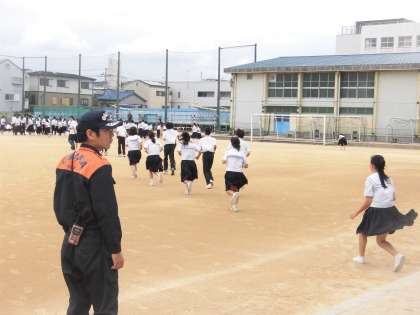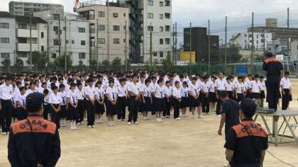 本日(2日)の6時間目、鶴見消防署の署員の方々に来ていただき、校内での火災の発生を想定した防火避難訓練を行いました。わずか2週間前の6月18日(月)に大阪北部を震源とする地震が発生し、実際に運動場に避難するという経験をしたばかりです。生徒たちはとても機敏に動き、点呼も大変スムーズに行っていました。署員の方からは、消火器を使った初期消火、消防署への通報、迅速に避難することの大切さについてお話しいただきました。いつ、どこで、どんな災害に遭うかわかりません。このような訓練の機会を通して防災や減災に対する意識を高め、普段から十分な備えを心がけてほしいと思います。