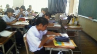 本日(3日)の6時間目、1年2組の国語の授業(担当:山原教諭)では、聞き取りテストが行われていました。最初、教材のCDに録音された文章の朗読を聞き、要点をノートにメモします。次に、配布された問題に答えていくという流れです。文章の朗読を聞いている間、生徒たちは、熱心にメモをとり、その後、問いのプリントを見ながらしっかりと答えを書いていました。読むこと、書くこと、聞ことく、話すことのバランスを工夫しながら授業が展開されていました。