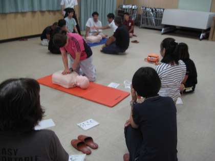 本日(19日)の放課後、多目的室で教員対象の救命救急講習を行いました。AEDも使いながら、心臓マッサージ(胸骨圧迫)や人工呼吸、AEDを用い、連携しながら、万が一の救命のための訓練を行いました。