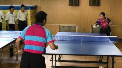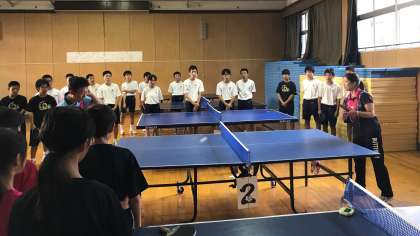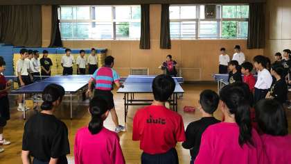 放課後は格技室にて、卓球部の生徒の指導をしていただきました。どの生徒も、新井選手のお話に真剣そのもの! ちなみに、お相手をされているのは新井選手の奥様です。奥様も、コーチとして、一緒に普及活動をされているそうです。