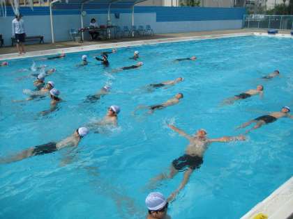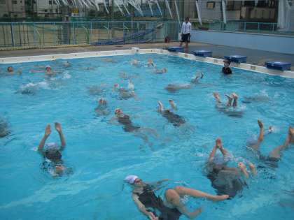 水中からのジャンプや、仰向けの姿勢を保ちながら浮いたり、水中で回転したり、シンクロの基本的な要素を入れながら、楽しく授業を進めていきました。