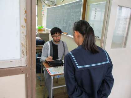 本日(11日)、3年生の英語の授業時間に、一人ひとりにスピーキングテストが行われていました。C-netのケビン先生の英語での質問に対して、英語でスピーチします。英語科では、「読み・書き」とともに「聞く・話す」活動を大切にしています。生徒たちは、少し緊張しながらも一生懸命に英語で伝えていました。