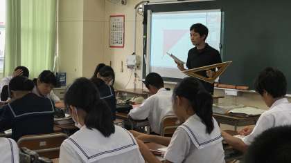 2年生の数学の授業で、高溝教諭による、プロジェクタを利用しての動点の問題に取り組んでいました。点が動くことによってできる三角形の面積問題を、実際に点を動かしながら、面積がどのように変化するのかをみんなで考えていました。