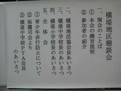 この横堤地区懇談会は、平成11年から、横堤社会福祉協議会、連合町会をはじめ地域諸団体の皆様、鶴見警察署をはじめとする関係諸機関の皆様、小学校、中学校が一つとなり、「横堤地域の子どもたちをどのように見守り、育成していけばいいか」ということを本音で話し合う場で、取り組みを始め16年目を迎えました。