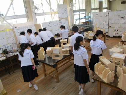 上の写真は技術室での技術科(1年:木工作品・2年:ラジオ・3年:下敷きデザイン)、理科(1・2年:夏休み自由研究)、パソコン部(親守歌・グラフ・ペーパークラフト模型)の展示発表の様子です。下の写真は第一学習室での国語科(1・3年:俳句・書写作品)3年生(修学旅行の壁新聞)の展示発表の様子です。