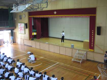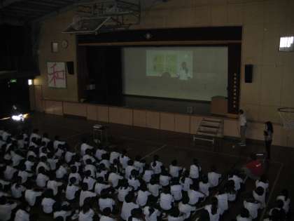 生活指導講話の後、保健委員会の生徒たちが熱中症対策のために作成したDVDを、保健委員の進行により、全校生徒で観ました。