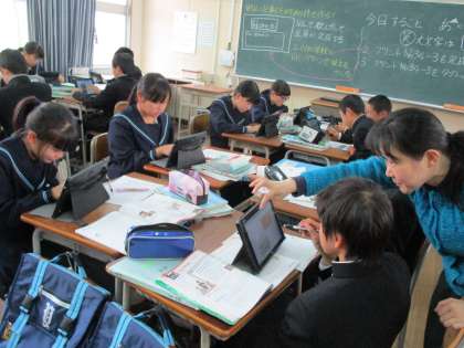 写真は、本日(1日)、1年生の英語の授業の様子です(担当は脇田教諭)。例文を参考にして、グループごとに横堤中学校の紹介文を英語で作成するという内容です。生徒たちはタブレット端末を巧みに操作しながら、事前にワークシートを使って作成した英文を入力していました。英語を使った表現力がグングン高まってきていることがわかります。プレゼンテーションが楽しみです!