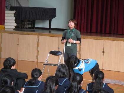 本日(7日)の5・6時間目、2年生は体育館で、社会法人日本ライトハウスの盲導犬訓練所の方の講演を聞きました。2年生では、先日、アイマスク体験をしましたが、今日はさらに、視覚障がいとは何か、視覚障がい者の方々が、普段どういうことに困っておられるのか、どのような声かけや援助がもとめられているのか等について、多くのことを学ぶ機会となりました。また盲導犬がどのような訓練を受けているのか、またどういう誤解があるのか等についてもいろいろな知識を得ることができました。犬のジョア君がとってもおとなしく、また賢くて生徒たちも感心していたようです♪