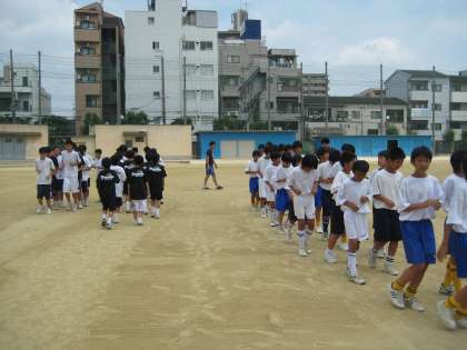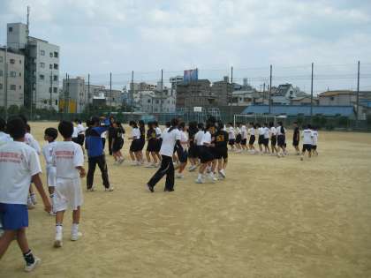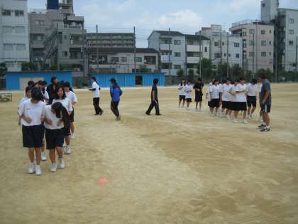 多目的室での講義の後、運動場に出て、正しい無駄のないランニングフォーム作りのために、河端教授と関西大学の4名の学生から指導を受けました。