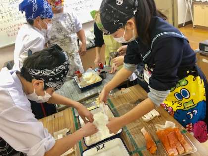 初めての炊き方でもご飯を上手に炊けており、準備、調理、片付けと手際よく行えていました。写真は2-1と2-3の調理実習の様子です。