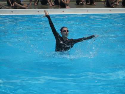 ウォーミングアップを兼ねてシンクロの基礎的な動きを練習、その後クロールを教えていただき、最後には音楽に合わせて全員でシンクロにチャレンジしました。簡単な動作でしたが、全員で協力し、まとまりのある演技ができました。また、随所に美しい泳ぎを見せていただき、ゆったりとした動作にもかかわらず、その進む速さにびっくりしていました。最後にはシンクロの模範演技まで見せていただき、美しくダイナミックな演技に生徒たちは感動していました。短い時間でしたが、有意義な授業となりました。