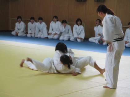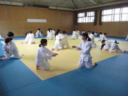本日(7日)の5時間目、格技室で2年生の女子の保健体育の授業が行われていました。単元は「柔道」です(担当は中村教諭)。入念に準備体操をしたあと、全体で寝技の練習を行いました。次に寝技による紅白戦が行われました。生徒たちは、しっかりと組み合って押したり引いたりしながら、身に付けた技をいろいろと試していました。どの試合も熱戦で、拍手や声援も元気いっぱいでした!