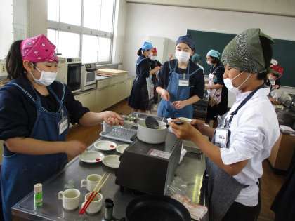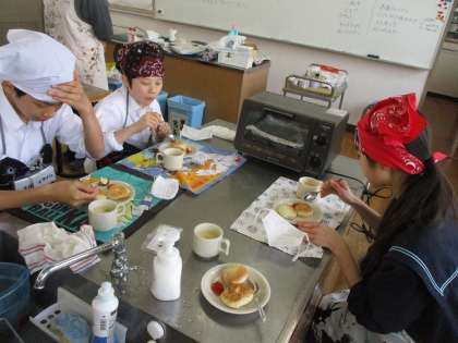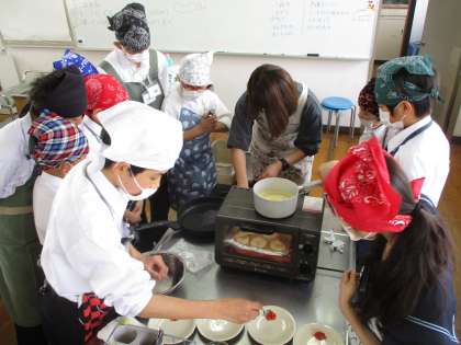 本日(12日)の5時間目、1年生の技術家庭科(家庭領域)では調理実習が行われていました(担当は取嶋教諭)。作るのはスコーンとコーンスープです。エプロンと三角巾で身を包んだ生徒たちは、班ごとに協力しながらとても手際よく調理実習に臨んでいました。こんがりと焼けたスコーンにいちごジャムを塗っていただきました。温かいコーンスープもスコーンによくあっていました。香ばしく仕上がり、とっても美味しくできました(試食もさせていただきました。ごちそうさまでした)♪もちろん後片付けも完璧でした!