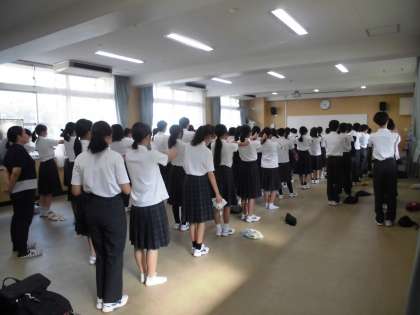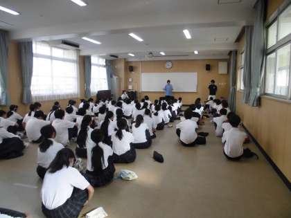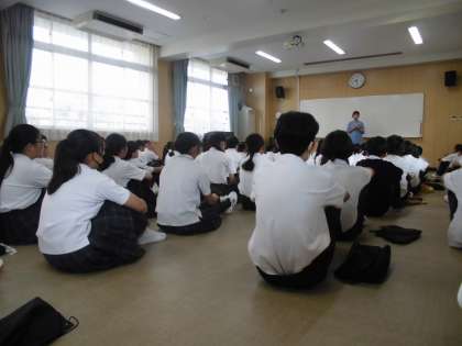 1年生の学年集会では、担当の先生から座っているとき、立っているときの姿勢についてのお話がありました。