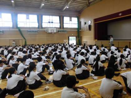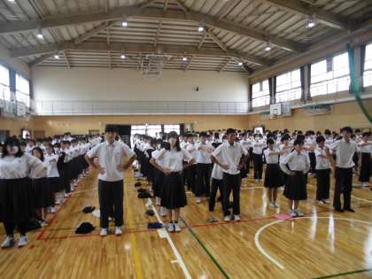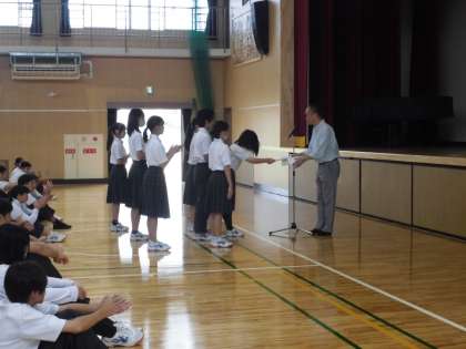 今日の全校集会は、校長先生のお話のあと、後期生徒会役員・各委員の認証式を行いました。