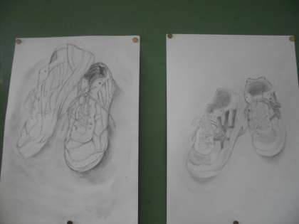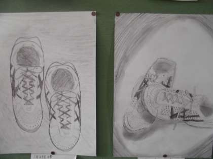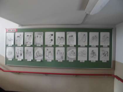 階段に1年生の美術作品(デッサン)が掲示されています。