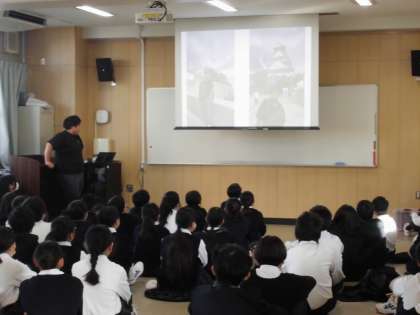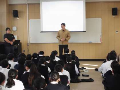 1年生の学年集会では、担当の先生から「居住地交流」についてのお話がありました。