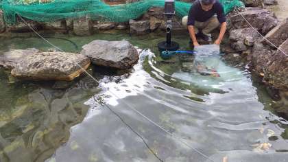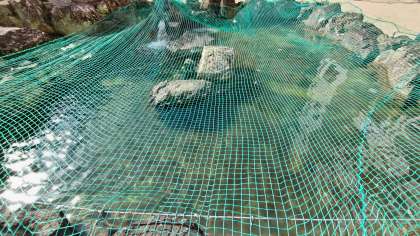 まだまだ成長途中の若鯉のため、鷺よけのネットを張っています。