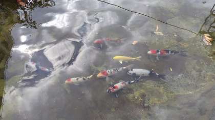 色とりどりの鯉が元気に泳いでいますので、お昼休みに会いに来てください。