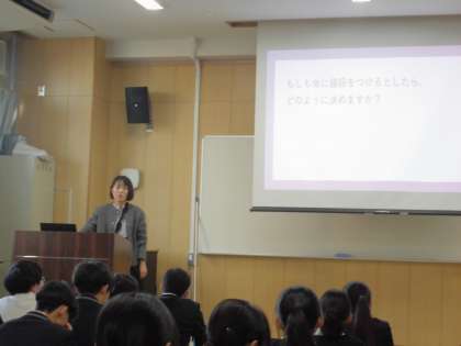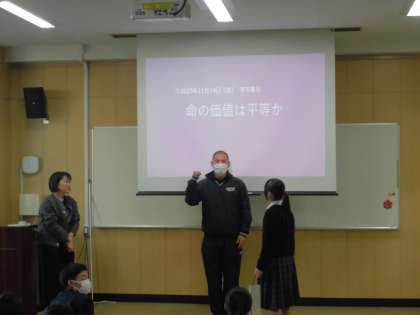 3年生の学年集会では、担当の先生から「いのちの価値」についてお話がありました。
