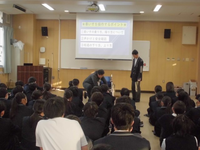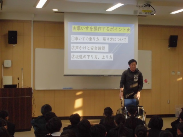 2年生の学年集会では、2月に実施する『車いす体験』に向けて、車いすの使い方のお話がありました。