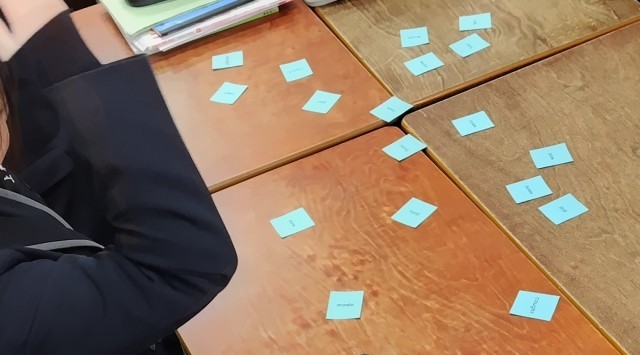 CーNETの先生が、不規則動詞の現在形を読み上げると、生徒がその動詞の過去形の札を取るというルールです。