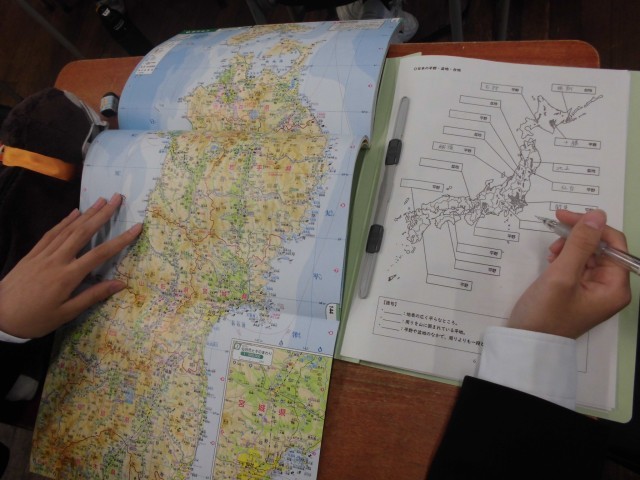 2年生の社会では、地図を使って日本の平野・山地を調べています。