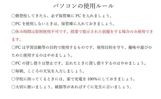 本日の全校集会で、生活指導担当の先生から個人端末(PC)の使用ルールについて説明がありました。