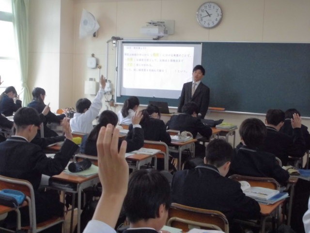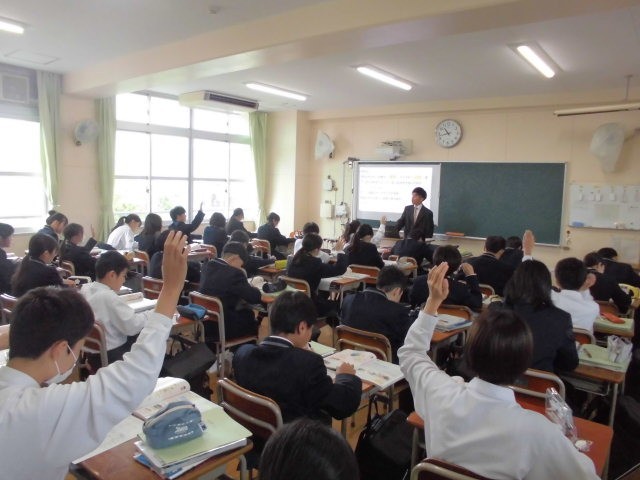 先生の質問にたくさんの生徒が手を挙げて発表しています。