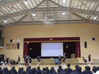 1学期の始業式のようすです。校長先生のお話のあと、離着任された先生方の紹介、各学年の先生方の紹介がありました。そのあとの全校集会では、前期生徒会の認証式と、春休みの部活動で表彰を受けた卓球部(個人戦...