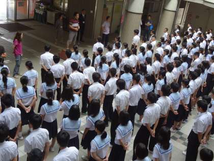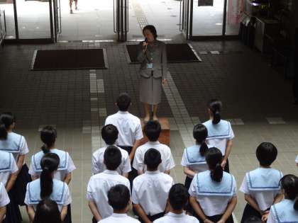 毎週月曜日は、朝の全校集会を行っています。運動場が校舎と道路を挟んで隔てられているため、ピロティ—での集会です。予鈴が鳴り終わると音楽が流れ、学代を先頭にクラスごとに教室からピロティ—に移動します。