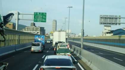 阪神高速神戸線を上っています。現在深江付近です。自然渋滞しています。