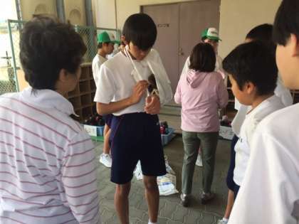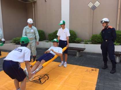 体育館前では、担架作製・搬送訓練、応急処置の仕方について学びました。