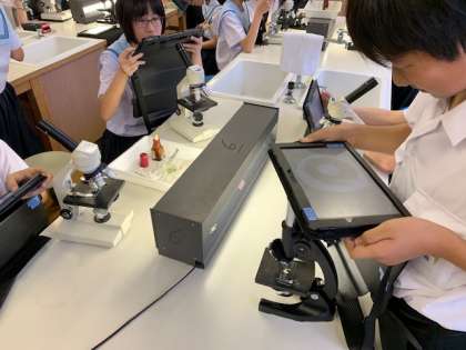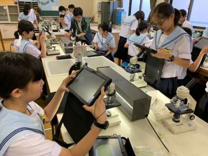 理科室では1年2組が光合成を学ぶために葉の表面を顕微鏡で観察し、それをタブレットで写真を撮り、画像を記録しました。