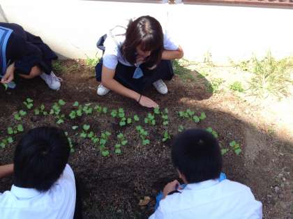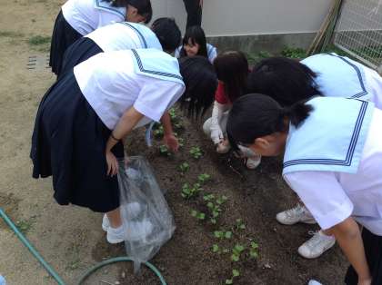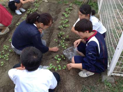 田辺大根の芽が順調に育っています。根がしっかり伸びるように、芽を間引きました。