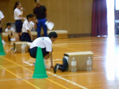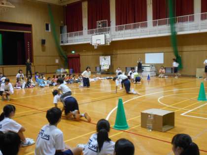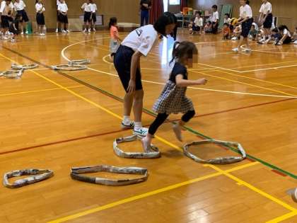 ミニ運動会では、3歳児、4歳児、5歳児がそれぞれ行える競技を考えて、各自が担当する学年の園児と一緒に楽しみました。