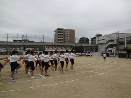 台風の影響を考え、朝から体育大会予行を行いました。開始と同時に雨がパラッと落ちてきましたが、午前中は大きく天候が崩れることもなく、予定通りに実施できました。