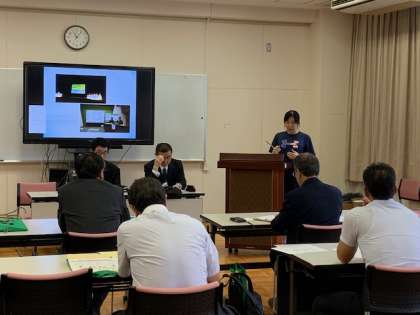 学校長からは、本校がICT活用事業を受け入れたこれまでの経緯について、システム担当者からは校内のICT環境について、教務主任よりICTを活用した授業についての説明を行いました。
