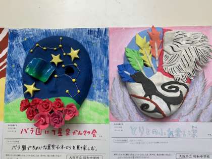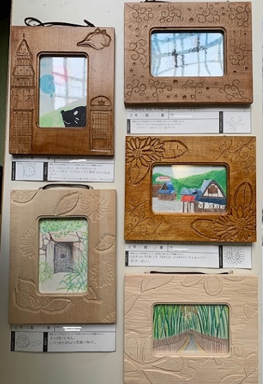 こちらの展示作品は、授業で制作した作品で、2年生の木彫作品『My Art Frame』(額縁)作りと、3年生が企画したイベント用の作品で『私が企画する〇〇に使う仮面』の作品です。