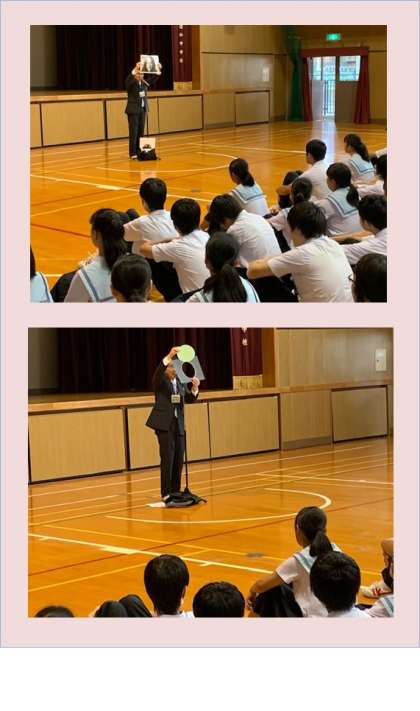校長先生より、数学者 秋山 仁 先生の講演会でのマンホールの形からルーロ—の三角形についての話がありました。疑問に感じたことを考え・解決していく力の大切さについての話でした。